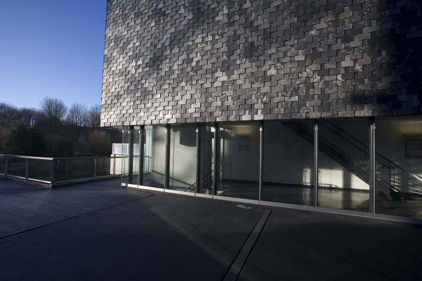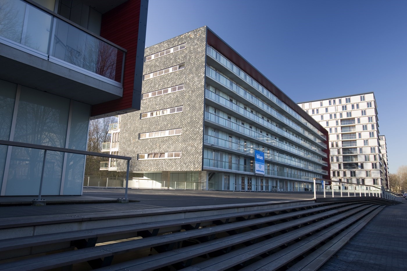 Langs deze ‘Esplanade’ vormen langgerekte houten trappen de overgang naar het dek waarop de torens en blokken staan. Daaronder ligt de parkeergarage. Alewijnse: ‘Bijna alle voordeuren en ingangen komen uit op de Esplanade. Dat geeft levendigheid. De treden en bomen versterken dat: je kunt er even lekker gaan zitten.’
