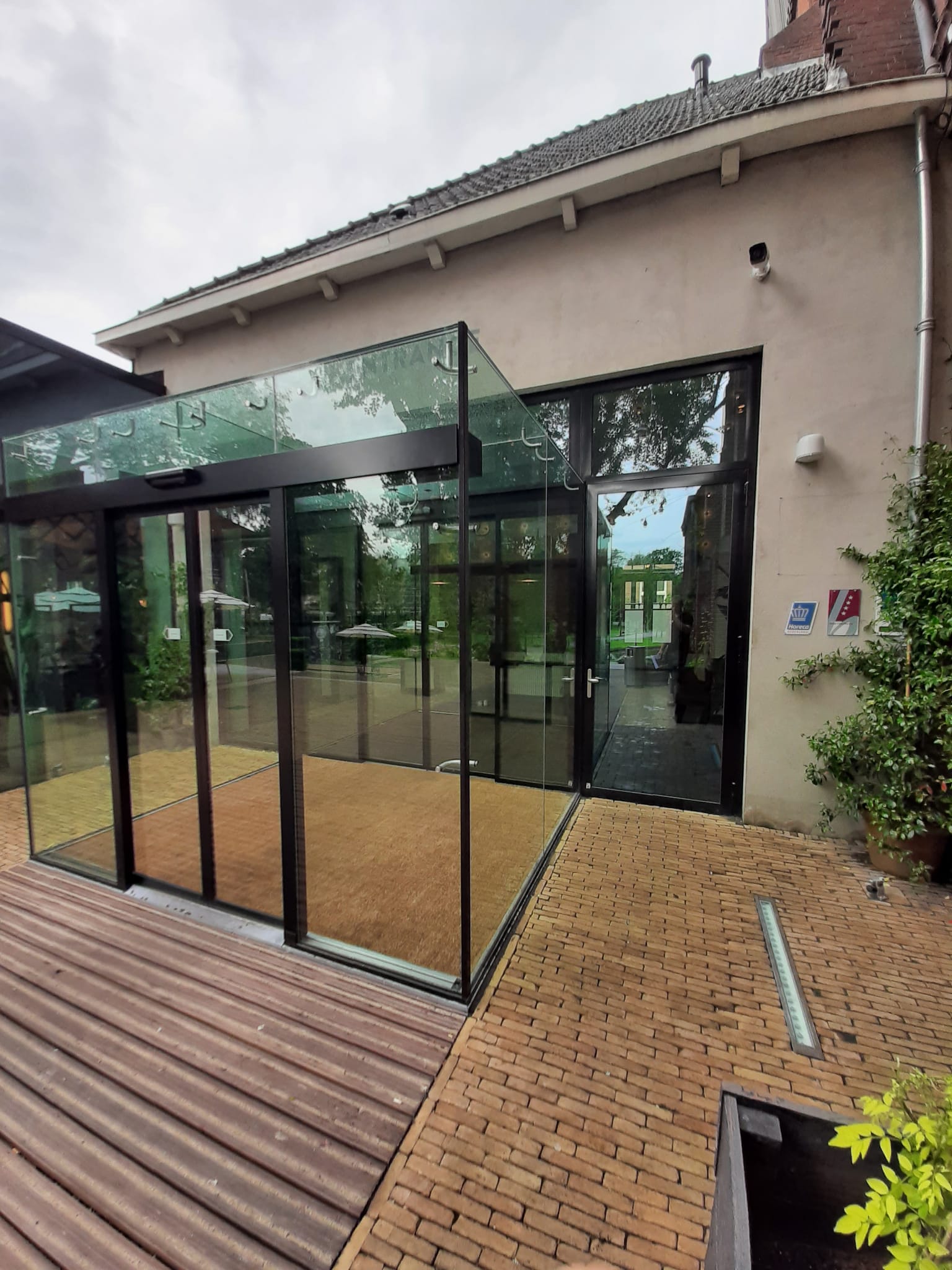 Mviewplus heeft bij dit project een Total Glas Tochtsluis geleverd en gemonteerd voorzien van 1 automatische schuifdeur met 2 vleugels. Hierbij zijn ook de RVS Metinox beugels aangebracht.